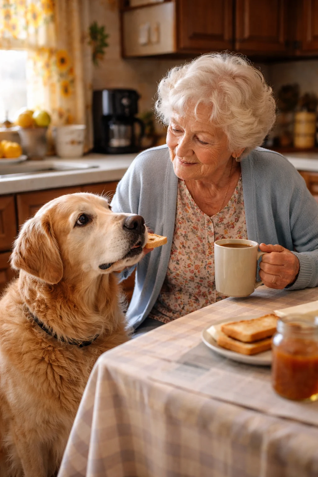Svako jutro bio je njihov mali ritual: instant kafa, lokalne vesti i mrvice tosta kojima je Marg pažljivo hranila Bejlija, kao da učestvuju u tajnoj ceremoniji dostupnoj samo njima. A kad Lili stigne, Bejli već struže po linoleumu od uzbuđenja — kao da nije prošlo dvadeset minuta od poslednjeg rastanka, već čitava večnost. 🍞📺
