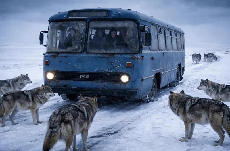 I onda — sumnja. Kroz snežnu zavesu, ispred, nešto se pomeralo. U početku, učinilo mu se da vetar valja nanose preko asfalta. Zatim — možda psi lutalice. Ali već sledećeg trenutka hladan talas mu je prešao niz kičmu. Nisu to bili psi. — Ma daj… — promrsio je sebi u bradu, suzivši pogled. Siluete su postajale oštrije: jedna. Pa druga. Još jedna. I još. Sivi, izduženi oblici polako su izlazili na put i zaustavljali se tačno ispred autobusa. Vukovi. Ne jedan, ne dva — desetine. Vozač je snažno pritisnuo kočnicu. Autobus je zadrhtao, točkovi zaškripeše po ledu, i stao je na svega nekoliko metara od čopora.