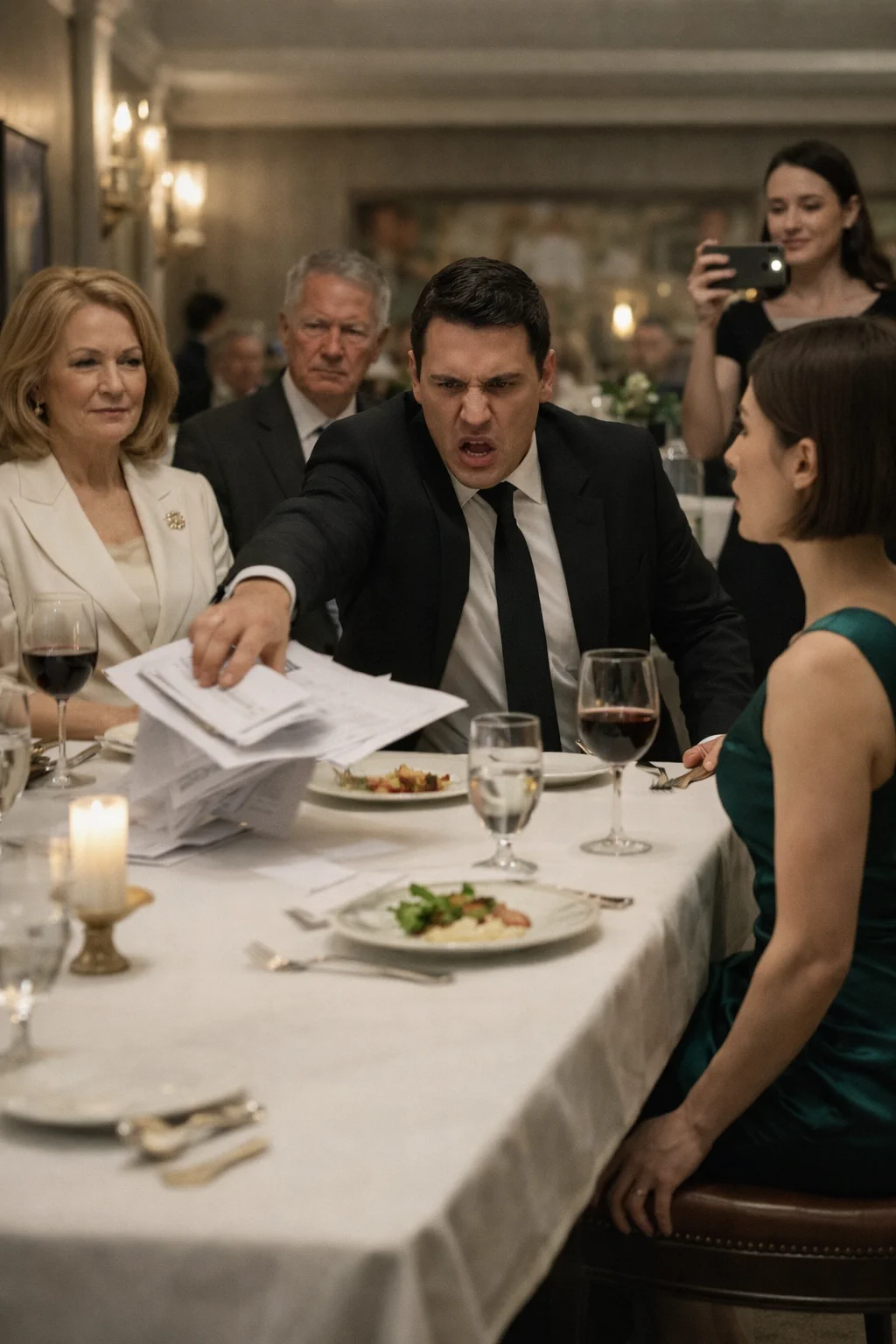 Na sred tanjira s biftekom sručio je kovertu. Peticija za razvod. “Kupujem tvoj deo zakupa, do jutra si van kuće,” izgovorio je glasno, da se čuje. Brenda je zapljeskala. Howard je nazdravio. Audrey je šapnula u kameru: “Internet obožava kad se zlatokopka razotkrije.” A onda je, na visokim potpeticama, prišla Sierra — njegova asistentkinja u crvenoj haljini, već uprta ruka oko njegovog struka.