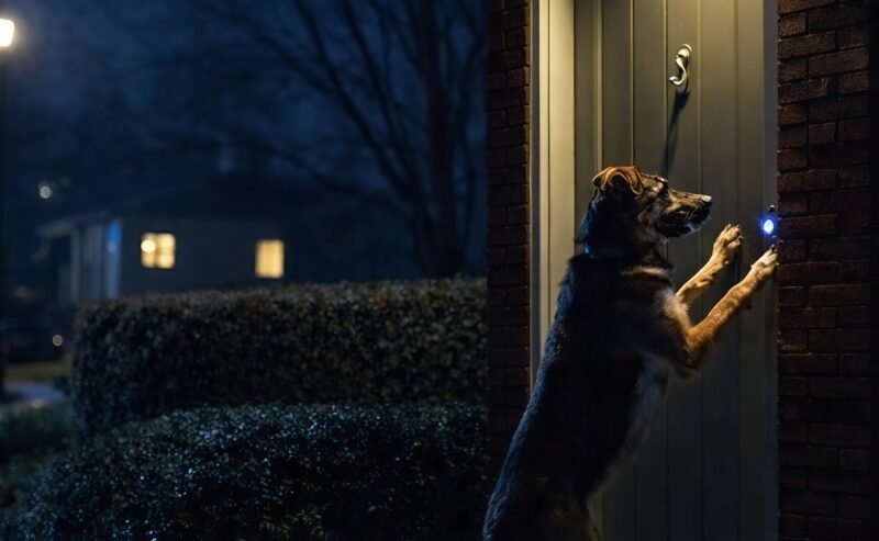 U senkama je nešto zatreperelo. Video je ježa od svetlosti i pokreta kako se diže na dve noge, naslanja na vrata. Pas. Velik, raščupan, mokar do kože, sa kapima vode koje kao suze klize niz brkove. Stajao je na zadnjim šapama, prednjima grebao, a njuškom — kao da zna — pritiskivao taster zvona. Iz grla mu se oteo kratak, ranjen skik, pa tih jecaj koji ne pripada noći, već pozivu u pomoć.