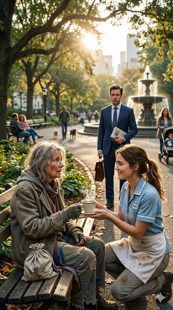 Tog dana, međutim, sve se promenilo kada ju je ugledala—staricu pogrbljenu na izlizanoj klupi, u džemperu previše tankom za jutarnju studen. Ruke su joj drhtale, u prstima komad ustajalog hleba. Lice je nosilo tihu dostojanstvenost ljudi koje je svet zaboravio. Valeriji je u trenu postala baka koju je prerano izgubila. Od tog jutra, u ogromnoj kuhinji vile ostavljala bi vode da provri, sipala kafu u termalnu šolju, ubacivala dva paketića šećera—i kretala kroz park.