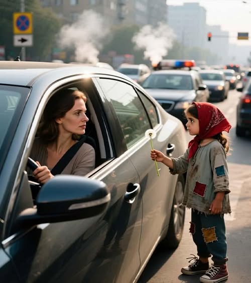 Kasno veče, gužva pred našim naseljem. Čelična reka automobila. Tada — kucanje na bočno staklo. Devojčica od desetak godina, beonjava kosa u dve raščupane pletenice, velike modro‑plave oči. Duga šarena suknja, iznošen šal, niske perlice — nalik Romkinji, a lice fino, kao iz narodne bajke.